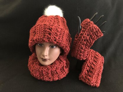 Not your ordinary ribbed hat set; includes hat, cowl and fingerless gloves crochet pattern. This has a "twisted" stitch design giving it lots of "flair". Unisex design looks cute with or without pompom. Chunky yarn makes this a great warm hat for cold weather. Works up quickly . . . you'll want to make several sets.Hat can be made to fit adults, child and toddlers.