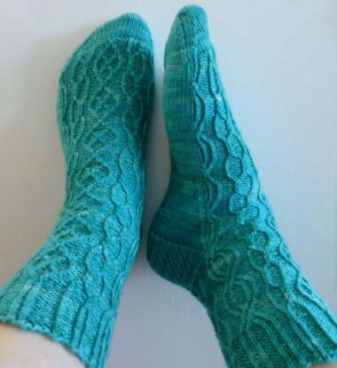 Twisted Windows Socks feature a modern take on a traditional twisted-stitch stocking. Use a solid or a semi-solid yarn in a lighter color to best display the intricate twists and turns!