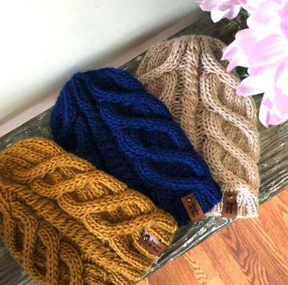 Take a ride on the cable train with this super fun project that has loads visual interest and a tiny bit of slouch. This hat is knit in the round with the smaller size needles for the ribbing and the larger size for the body. It’s the perfect cold weather accessory and either of the cable sections can be worn at the front or the side for two different looks. We all need options!