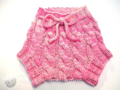 This soaker pattern is based on my Twisty Trousers longies pattern, and is worked entirely in cables. This soaker is worked in the round from the top down with short rows for added room in the rear, then the crotch is worked flat in two pieces and grafted with Kitchener stitch. Detailed instructions for grafting in pattern are included.