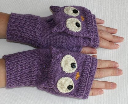 In the UK, Brownie leaders are called owls; Twit Twoo was written for a Brownie leader friend of mine who wanted a pair of owl-y mitts to wear to Brownie events. The mitts are fingerless with a flip top to keep your fingers warm whilst keeping them accessible for when you need them; instructions are given for both short and full thumbs. The sample mitts are knitted in a DK-weight wool/acrylic/nylon blend that is warm without being bulky, and the added nylon makes them stronger and more hard-wearing than pure wool.