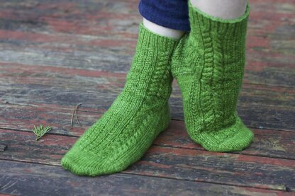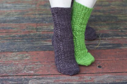 Two cables travel in parallel down the leg of this sock, cross together at the gusset, then continue their parallel journeys to the toe. Knit in a sportweight yarn, these socks are cozy and warm