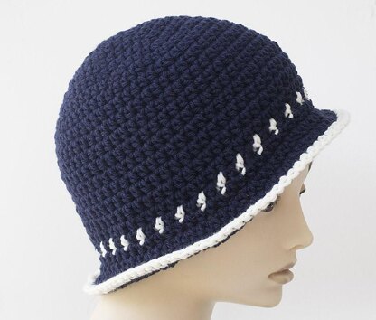 A 1920's style cloche hat with a contrasting brim and little dots. The pattern calls for readily available worsted weight yarn. It is easy to adapt for different size heads. The pattern is not difficult and works up quickly but is best for crocheters with a little experience. The pattern is copyrighted by Judy Stalus 2018. The pattern is intended for personal use only. Reproduction in any manner, including electronic reproduction is prohibited. This means that printing multiple copies, electronic copying, scanning, posting to the internet or otherwise distributing in any form is prohibited. Please do not sell this pattern.