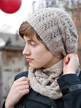This lightweight closer fitting neckwarmer in three sizes (petite/medium/tall), features a reversible vertical lace and cable motif that reveals a complete changeup from back to front, with each side equally appealing. Delicate and airy, the openwork pattern shows off the halo of a fine luxury yarn, but the pattern could also be knit on larger needles with heavier yarn for extra warmth and a bolder look. The easy to knit pattern, worked entirely in the round makes an excellent gifting project and a very portable traveling companion.