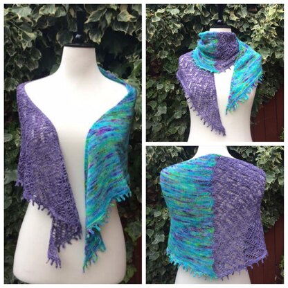 Worked from a garter tab cast on, this shawl is a tale of two halves! One side is simple stockinette and is designed to work perfectly with a lovely variegated yarn, and the other side keeps things interesting with an easy repeat lace pattern in a contrasting solid or semi solid shade.