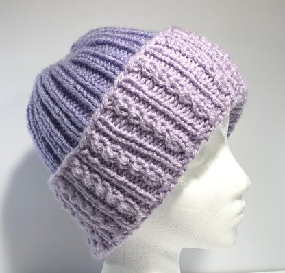 Such fun to knit, and you won’t need a cable needle either! A fun pattern that will help you use up two tones of yarn, making a great thick warm hat. For either men or women (kids too) that will love this very warm hat. The pattern stitch is easy to do and tells you when to change the color and change stitch pattern, so you only work on one stitch pattern at a time. This is a great gift for just about anyone, so start one today, and maybe you will want to make another hat for yourself too! Worsted weight yarns, 16-inch circular needle US # 8