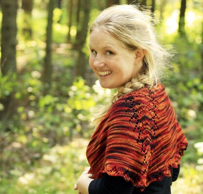 Two Twigs is a double spined shawl, the shape makes it stay nicely on the shoulders. It requires 400-600 meters of fingering weight yarn. Right side rows have lace patterning that is charted. The shawl is easily enlarged by adding repeats.