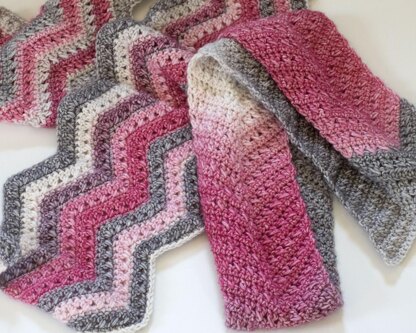 This pattern that works up quickly so is great for last minute gifts. It has an interesting chevron stitch pattern. There are two variations, one that is a skinny scarf, one a longer wider scarf.