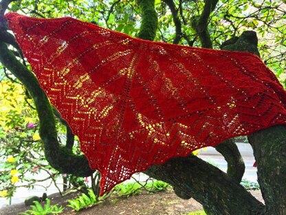 The small shawl is in the Cayenne colorway. The large shawl is in Smitten. Variegated gold beads were used in the small shawl; Toho Higher Metall