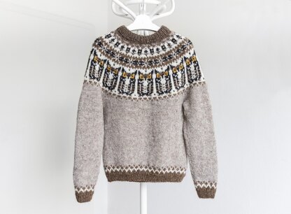 UHU Lopapeysa is a unique design in the tradition of Icelandic knitting. Body and sleeves are worked in the round from lower edge to underarms, then joined to work yoke in the round. Round begins at left side of body. On yoke, round begins on the left side of back at the joining of body and sleeve. For knitting the sleeves, I recommend using the ‘magic loop’ technique, which helps you to avoid bunching up when enlarging and working on pattern, and also saves your time.
