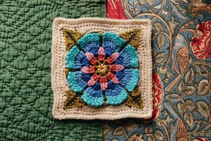 Like his fellow members of the Arts and Crafts Movement William De Morgan used abstracted flower designs in his ceramics rather than trying to create a true to life copy. Certain flowers featured more often than others, with carnations, roses and daisies possibly amongst his favourite floral design themes. This motif is based on a tile design called Moffatt which were produced at William’s Merton Abbey Factory. This motif is made by creating layers of crochet petals and leaves. Making them in a production line way, where you make all four at the same time and repeat the rounds on all pieces. This will help you remember the pattern and ensure your motifs come out the same size.