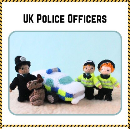 All parts are knitted flat and sewn up at the end. No circular knitting is required. The pattern includes a police car, male and female police officers, an officer with a tall hat, and a dog.