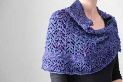 Inspired completely by the stunning jewel tones in Tanis Fiber Arts’ Cosmic Blue Label yarn, Ultravioleta is an airy, feminine shawlette with just the right amount of sparkle and texture. The piece is knit from the top center down beginning with a garter tab cast on, after which regularly spaced increase rows create a semi- circular shape. Small bobbles are added to the lacey chevrons’ “points” and a garter stitch band defines the edging. The lace is simple, but involves patterning on both the right and wrong sides; written instructions and charts have both been provided to help the knitter stay on track.