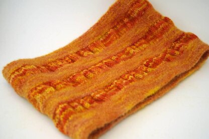 This cowl uses a simple combination of garter stitch and stockinette, with basic increases and decreases, playing the two textures off each other with two sport-weight yarns, one feltable and one not. Throw the cowl in the wash, and felting gives it a distinctive flavour all its own!
