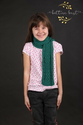 Umiel ist ein Schal mit einem breiten Keltenzopf sowie zwei einfachen Zöpfen an der Seite. Zusätzlich hat der Schal einen Schlitz, so dass man den Schal durchziehen kann.