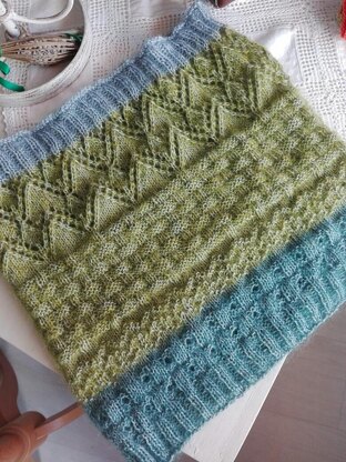 This cowl was designed to be made with a sock weight yarn held together with a Mohair/Alpaca lace weight yarn enabling you to use larger needles than usually called for when knitting with sock weight yarn. The Mohair or Alpaca will add that extra bit of fluff and softness to the sock yarn. However, feel free to use whatever yarn you want, but you might have to knit either more or fewer chart repeats to make it the size you want.