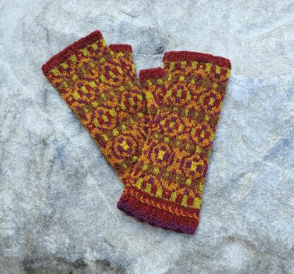 This is a pattern for a pair of mitts. Both are worked the same, from the cuff up and in the round using the Fair-Isle knitting technique. Optional embroidery details over the lower motif of the mitts and crocheted cuff may be added (instructions included).