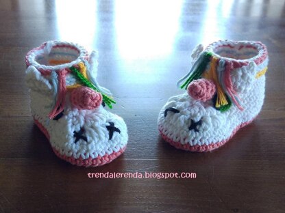 This pattern is for make a pair of crochet baby boots with unicorn inspiration. There are sizes between 0 and 12 months. If you don't make the horn you can get also a Little Pony baby booties.