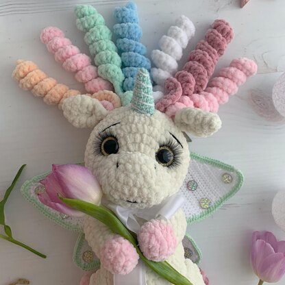 Required materials: • 1 skein of main color plush yarn (white or milk color) (100gr(3.5oz)/120m (131yd- Super Bulky:6 per 1 skein). I used Himalaya Dolphin Baby #80308 • A little of pink color plush yarn. I used Himalaya Dolphin baby #80303 • A little of different colors plush yarn. I used blue, peach, white,pink, mint and old pink colors. • A little any cotton/acrylic white and mint colors yarn for horn and wings. I used Alize Cotton Gold #55 (white) and #15 (mint) • 4mm crochet hook for toy and 2mm for horn and wings • safety eyes 20mm • eyelashes + transparent glue-gel • for wings you can use beads, sequins, buttons… • soft stuffing • thin long needle and needle with a large eyelet • marker • yarn cutter or sharp scissors