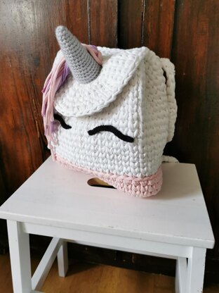 Yarn: Hooked spaghetti approx. 1 spool of white and ½ of pink, some black aran weight yarn for the eyes, and some grey bulky weight yarn for the horn.