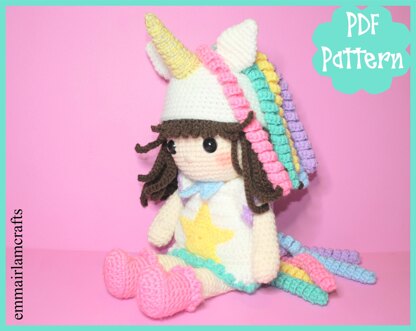 ※ ITEM DETAILS: This listing is for a Unicorn Girl Doll crochet pattern in pdf format, NOT a finished item. Finished doll will be approx. 16" tall (with hat on) when made with specified DK yarn.