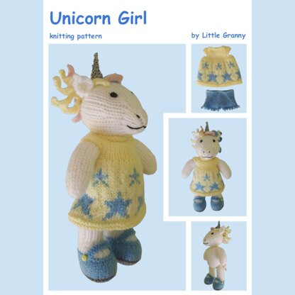 This pattern tells you how to knit a Unique Unicorn Girl wearing a top down dress and frilly knickers. Her shoes are knitted as part of her body but the clothes are removable. She is knitted flat on two needles and the pieces are seamed up afterwards. This pattern comes as a PDF file and contains step by step instructions, colour photographs and handy tips.