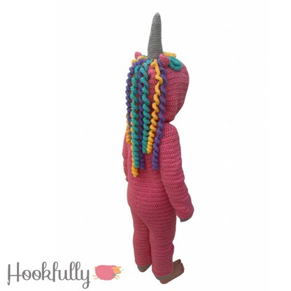 This crochet pattern is for a unicorn kids onesie pyjamas. The children’s clothes are suitable for children aged 2-10 years and includes 8 sizes which are listed below. The kids sleep suit is crocheted in one piece and the unicorn decorations are made separately and are sewn on at the end. The hooded onesie buttons up the front and has unicorn themed decorations including a horn, ears, mane and flowers. The onesie can be used as pyjamas, fancy dress or even as a overcoat for cold winter walks.