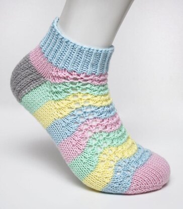 This is a toe up sock pattern, worked in one piece, from the toe up to the cuff. Casting on requires using a two needle cast on method. The toe of the socks is knitted first, before moving onto the foot, the gusset, the heel, then the leg and finally finishing on the cuff. A stretchy cast off is used to cast off the stitches of the cuff.