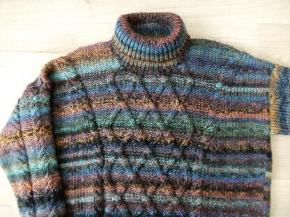 A cosy sweater with its interesting mix of wide trellis cable patterning, looks great for both men and women. The trellis panel is framed by a five stitch cabled edging on the stocking stitch side sections. These five stitches are widened at a certain point running outwards towards the shoulders. The sleeves also have cables incorporated, but could easily be worked just in stocking stitch with this lovely multi-coloured yarn.