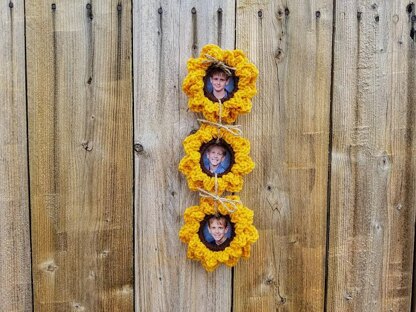 This pattern is easy with only 4 rounds. The only stitches you need to know are chain, slip stitch, single crochet, half double crochet and double crochet. You will crochet around a 1.75” plastic ring. (I got mine from gallon milk jugs) The sunflowers are then tied together using packaging twine.