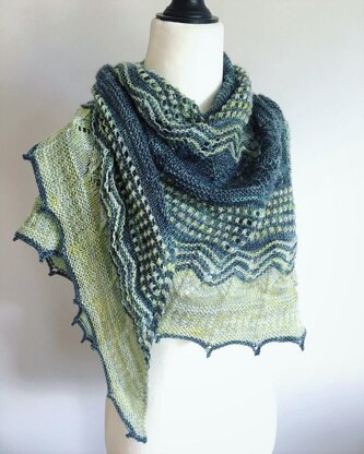 Upon A Shore is a classic symmetrical triangular shawl that is worked top down in sections of various stitch patterns and shaped with the centerline and side increases. The knitting starts at the centre of the top edge with the garter tab cast-on. Increases along the centerline are made in a simple eyelet stitch pattern to create a soft and delicate line between two wings.
