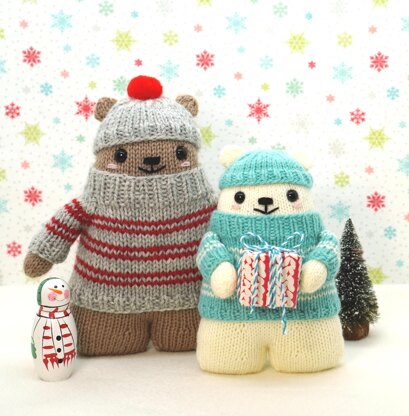 Two adorable bears to knit and love, from their little round ears to their chunky feet! Dress them up in cozy striped sweaters and bobble hats, or just enjoy them in their natural state. Ursula and Bernard Bear are both knit from the same instructions, simply using different weight yarns and needle sizes to achieve the different sizes. This way, you can choose the yarn type you already have, or that’s easily available to you. All the toy pieces are knit in the round on double pointed needles, and the only major seams are at the bottoms of the feet. Skills required include: stockinette, m1L and m1R increases, kfbf increase, k2tog and ssk decreases, picking up stitches, working stripes, and ribbing.