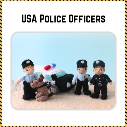 All parts are knitted flat and sewn up at the end. No circular knitting is required. The pattern includes a police car, male and female police officers, and a dog.