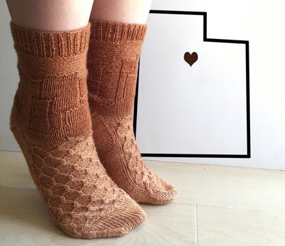 Utah, also known as the Beekeeping State, is home to many beautiful national and state parks. This sock was inspired by both the rock formations in the many parks and by the honeycomb found in beehives.