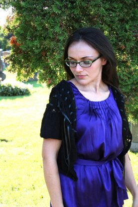 Ribbons dance around the yoke of this whimsical lace and stockinette hooded cardigan. The numerous ribbon rows allow you to wear this cardigan in many ways: open, with ribbons streaming. Closed at the neck, with one lovely bow tied. Choose a wider ribbon in a contrasting colour for a more dramatic effect. Or, use no ribbon at all and wear it open, perhaps with a pin.