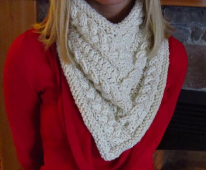 This cozy, cabled cowl almost resembles a shawlette from the front. But since it’s a cowl, it stays put; no need to fuss with keeping it in place. The V-neck shape keeps you warm even when your neckline plunges. And the bulky weight yarn makes this a quick knit.