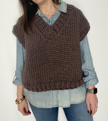 This vest is big, cozy, easy to wear, and a fun quick knit! This vest looks great alone or over a sweater, blouse or summer tank. You can wear it casually with jeans or dressy with a skirt.