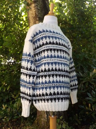 The sweater/pullover is worked from the bottom edge and up with multi-colored pattern stripes on the body and sleeves. The sweater has a traditional drop shoulder/set in sleeve construction. The Sweater has a folded sleeve rib with a thumb hole.