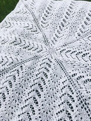 Vale is a baby blanket knit from the inside point in a lace pattern to the outer garter stitch edge. The blanket measures 32", but can easily be made bigger if one chooses to add more repeats.