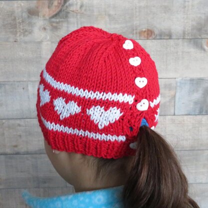 A Valentine’s ponytail hat for girls! This fun hat knits up fast, just in time for Valentine’s Day. Buttons let her wear her ponytail high, low, or in between. Two sizes let you knit for all your girls.