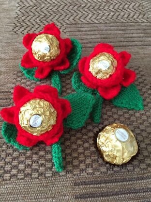 Knitted Rose containing a Ferrero Rocher Chocolate, can be used to enhance place settings on dinner table on Valentines Day.