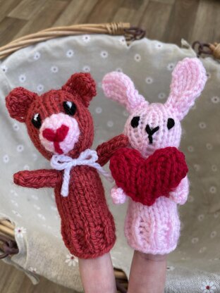 Learn to knit your very own Valentines Day Finger Puppets. Make a set of 2 puppets - Bear and Rabbit