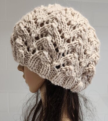 This quick knit chunky Beanie has a 2x2 rib brim then is worked in a lovely lace stitch.