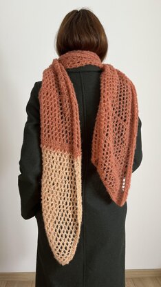 Lavorato con un punto traforato aperto per ottenere un tessuto leggero, fluido e facilmente adattabile. Il lavoro si esegue in piano con ferri da 7 mm. Si inizia dalla parte dritta e si prosegue fino alla punta triangolare. Si utilizzano circa 3 gomitoli per il colore principale e 1 gomitolo per il colore a contrasto, impiegato nella sezione a punta. La tensione è rilevata esclusivamente dal motivo traforato, escludendo i bordi a legaccio. Adatto a chi ha familiarità con i punti traforati di base e con semplici ripetizioni.Tensione: circa 15 maglie x 12,5 ferri = 10 x 10 cm a maglia traforata, dopo il bloccaggio.