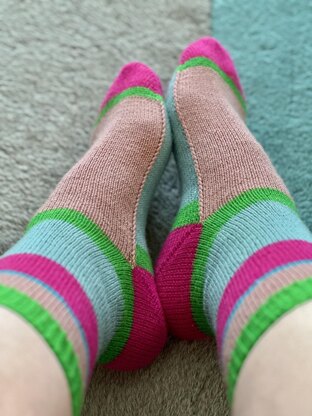 Valorie Socks are worked from the toe up, but are knitted back and forth in rows between the toe and heel. After completing the toe in the round, half of the stitches are held to be worked later for the instep. First the sole, then the German short row heel are worked separately and flat. Upon completing the heel, stitches are placed on waste yarn to be worked later for the leg. The instep is then worked while joining to the sole at the same time. Then the held heel stitches are returned to the circular needle and the leg is worked in the round. For an elastic edge, the cuff is bound off using the beautiful Jeny’s Surprisingly Stretchy Bind-Off.