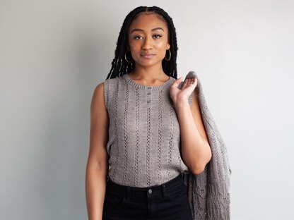 A lightweight multi-seasonal top to knit sleeveless, with short sleeves, or with long sleeves in twelve sizes (XS to L and 1X to 8X). Top features a simple openwork pinstripe motif with all WS rows in purl. Knit in a heavy lace yarn for a light, summery fabric or choose light fingering weight wool for a layering piece with a little warmth.