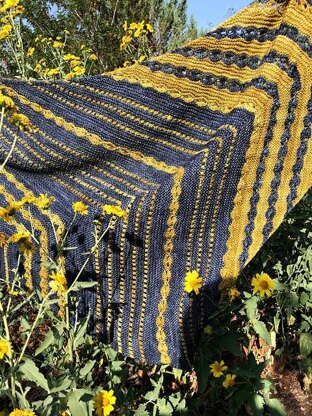 Vanderlynn is a 2 color shawl, with bands of pretty texture and lace eyelets. This is knit sideways with 2 colors or a mix of scraps.