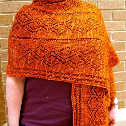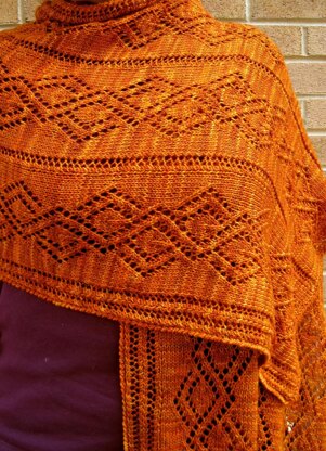This lightweight wrap features two lace stitches. The focal stitch is a fairly dramatic knit stitch that shows up nicely whether you are using solid, semi-solid or variegated yarn. It is a very elegant wrap without being difficult to knit. The final size is 22 1/2 inches by 72 inches. There are also instructions for an optional crocheted edging contained within the pattern, should you want it edged.