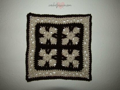 This square is made up of 4 smaller squares then sewn together with a few rounds around to make it s 9 inch square.