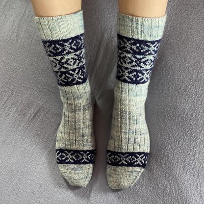 **MATERIALS:**Fingering weight yarn: Shown in MC: Yarn Bee Authentic Hand-dyed Tonal: 100% Merino wool (100g/3.53oz) 420 yds/384 m, in Spa with grey Thread Art Wooly Nylon & CC: Cloudborn Fibers Merino Superwash Sock Twist: 80% Merino wool/ 20% nylon/polyamide (100g/3.53oz) 467 yds/427 m in Navy